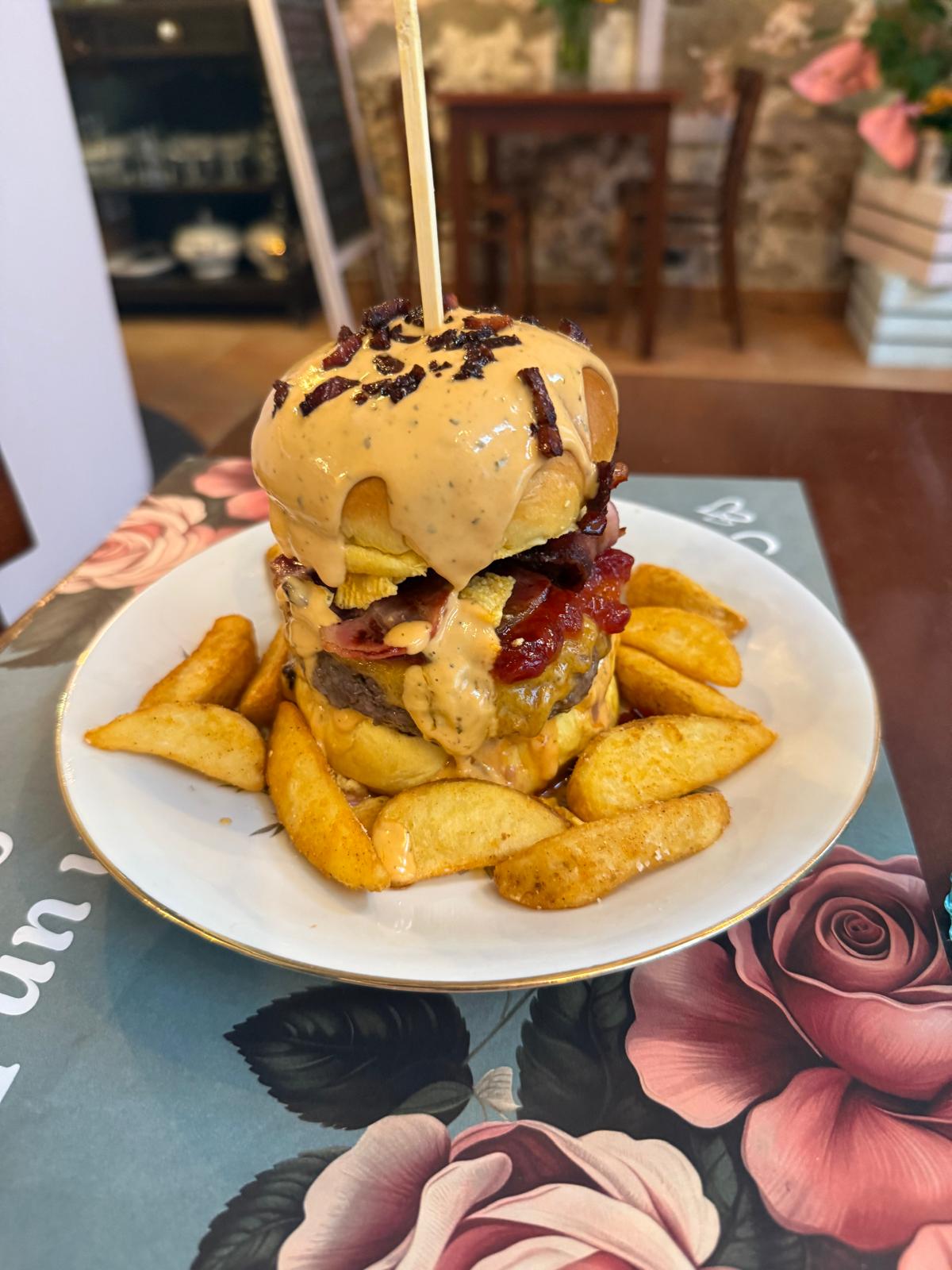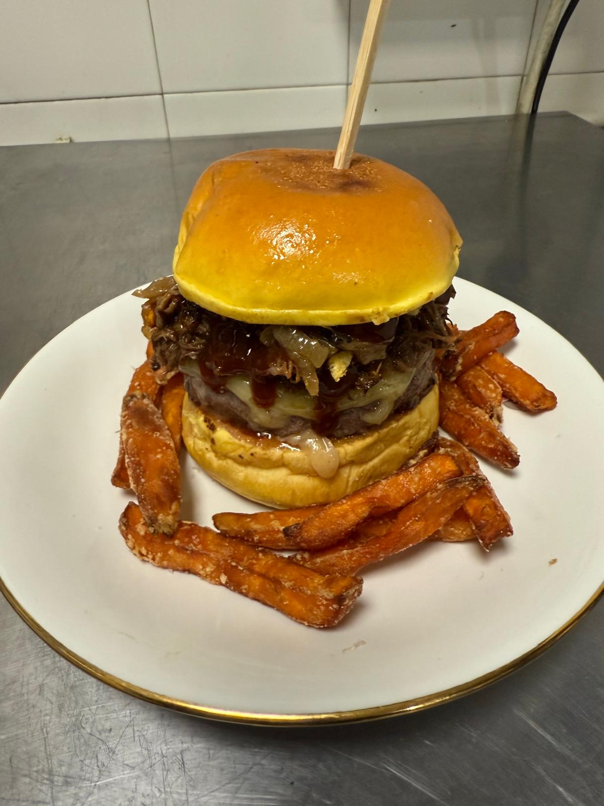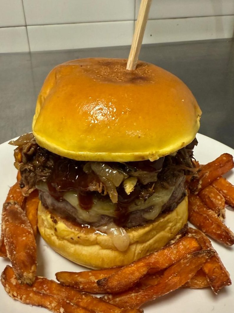 Pan de Patatas, Salsa Barbacoa, Queso Cheddar, Carne de ternera "Pulled Beef", Cebolla Carmelizada, Cebolla crujiente, Carne de Vaca.