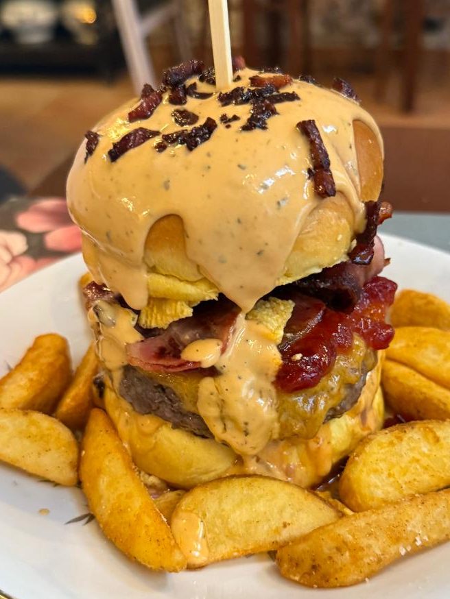 Pan de Patatas, Salsa Pedro Ximenez, Queso cheddar, Foie de Gras, Manzana carmelizada, Carne de Vaca