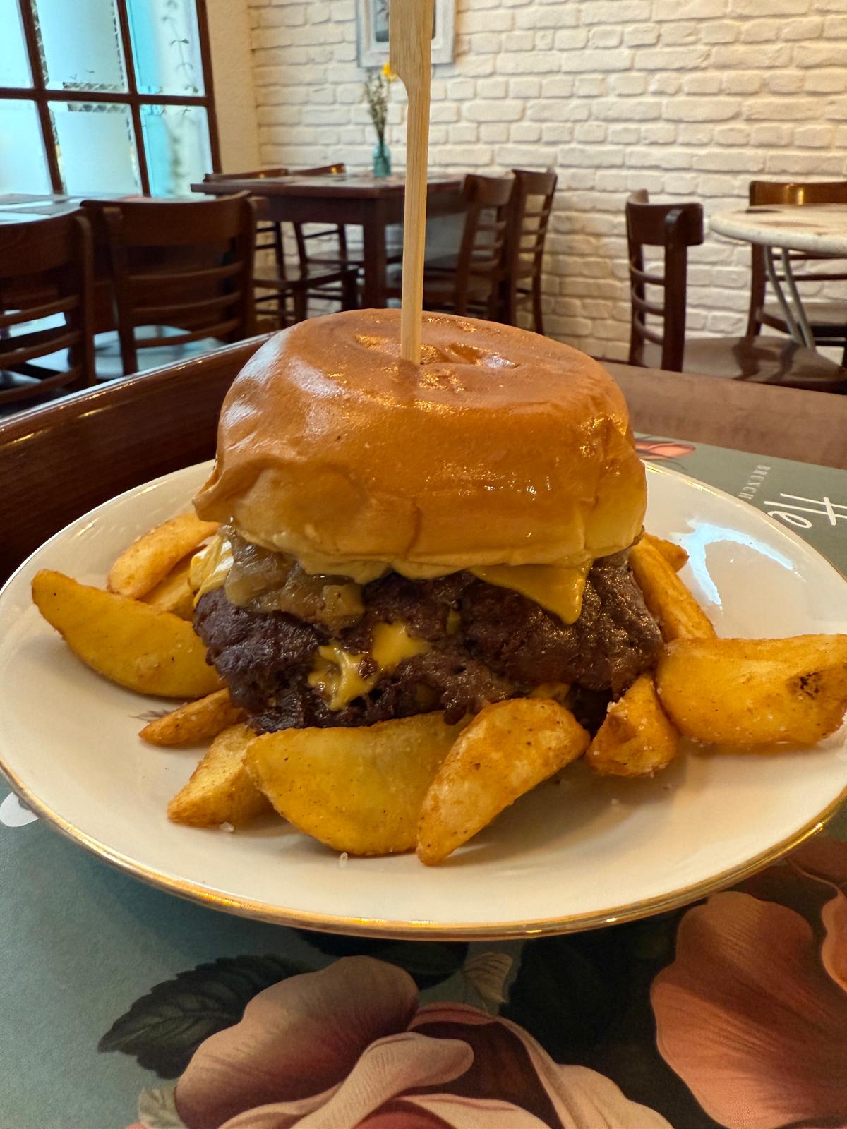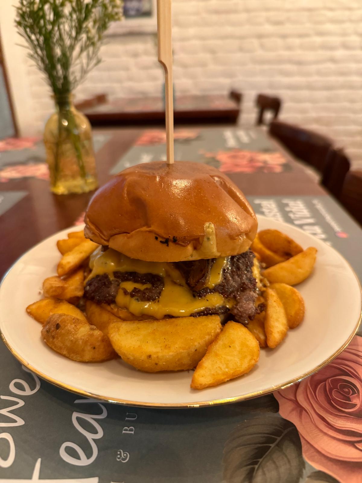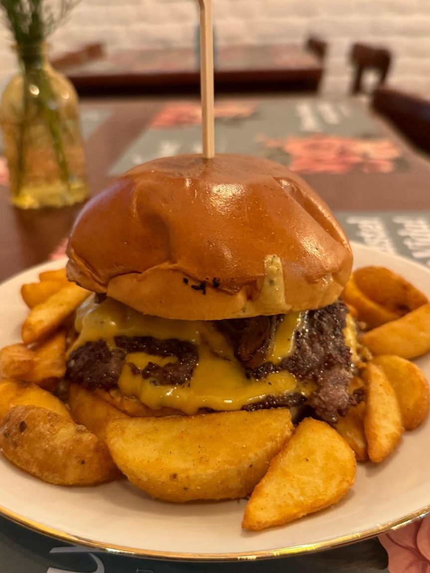 Pan de Patatas, Salsa American Burger, Queso Cheddar, Cebolla carmelizada, Carne de Vaca