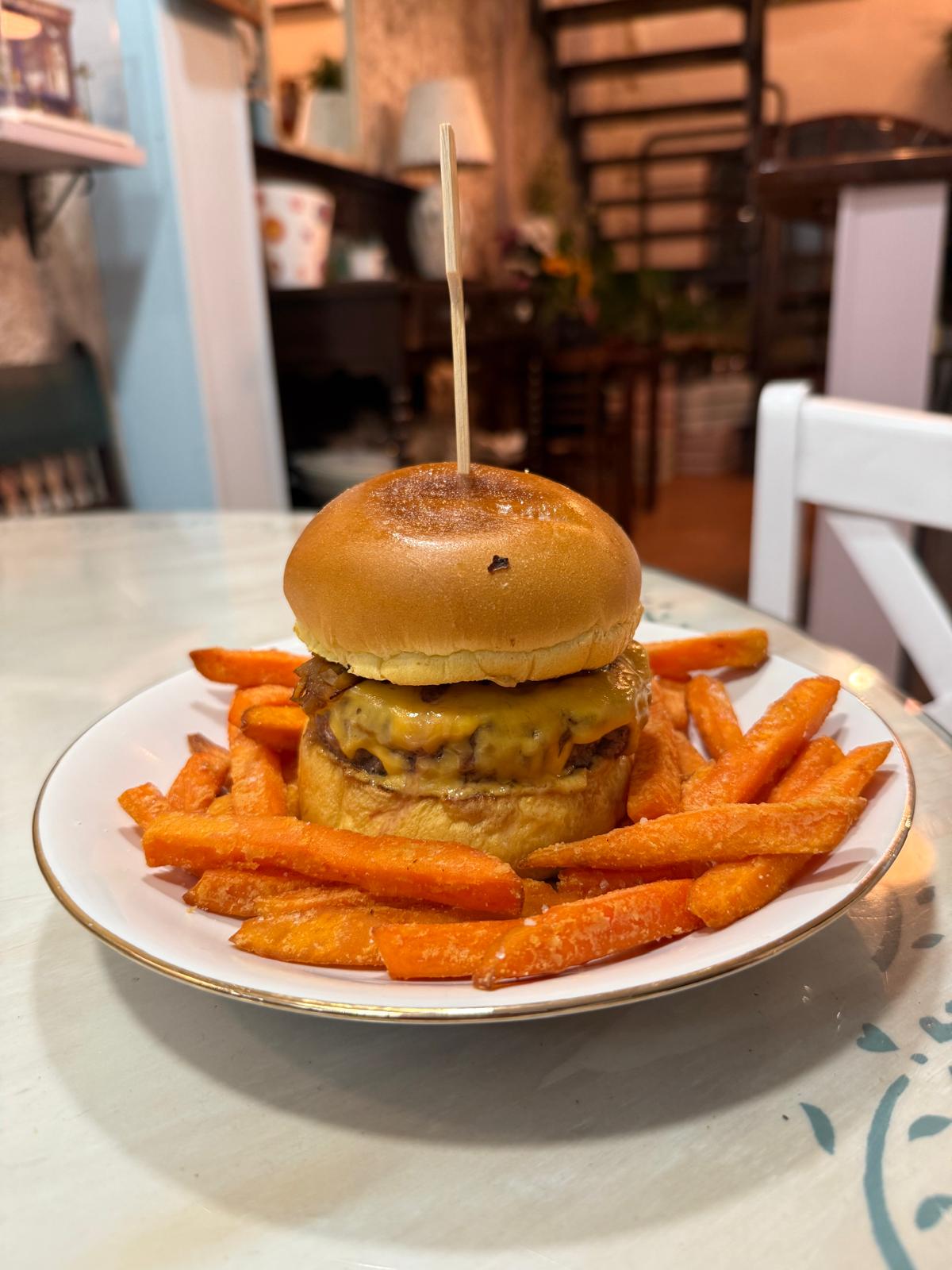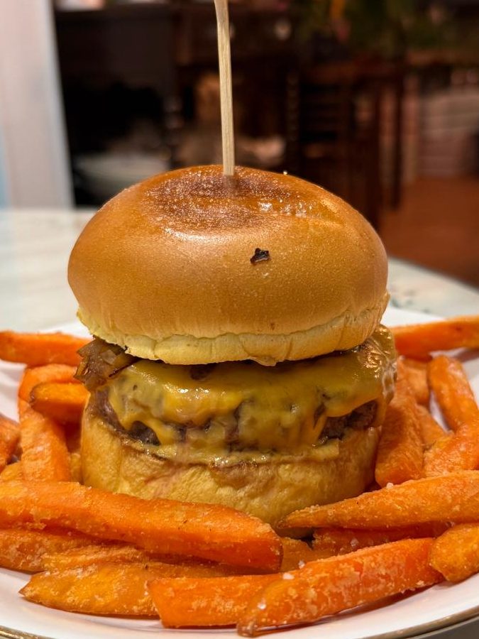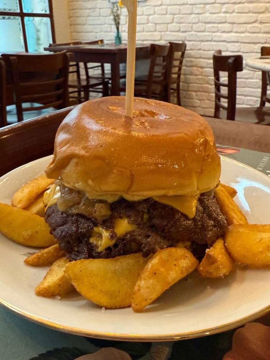 Pan de Patatas, Salsa American Burger, Queso Cheddar, Cebolla carmelizada, Carne de Vaca